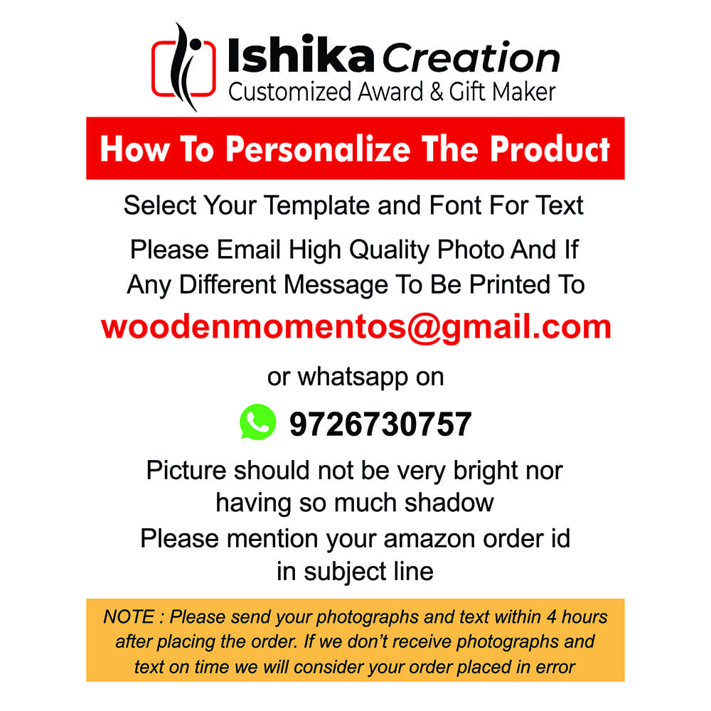 Explore a wide range of personalized wooden gifts from the house of Ishika Creation available on ishikacreation.in This personalized gift moment is made from premium quality MDF wood and is available in black color. This Gift Moment can be an ideal gift for your loved ones on all occasions like birthday wishes, anniversary wishes, thank you gift, appreciation gift, retirement gift, employee recognition, the business award for appreciation, You simply have to send us the image and text to be printed on the moment and rest of the thing we will do at our end. We will send you a computer preview before printing at the moment and after your approval, we will process printing and
