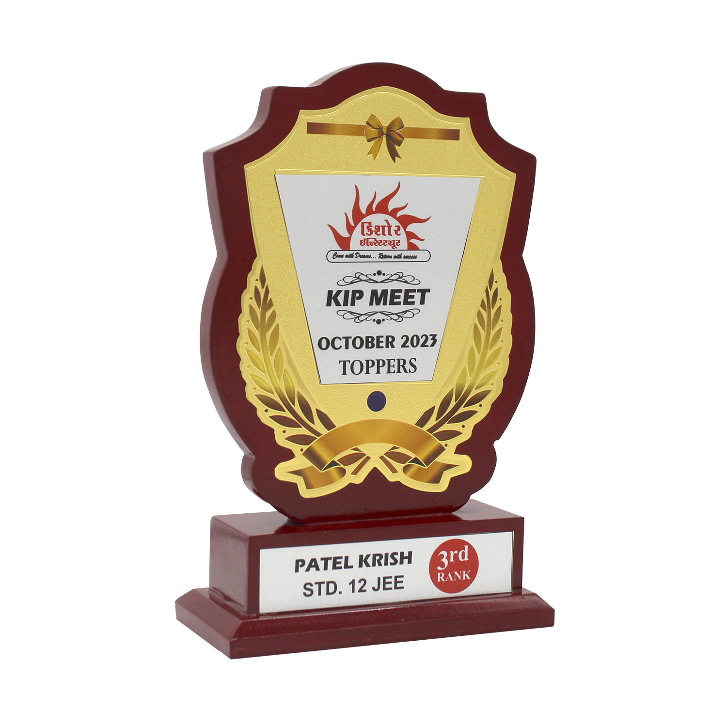 This elegant wooden shield trophy features a glossy maroon finish with a striking gold laurel design, making it an ideal symbol of achievement and recognition. Its premium finish and broad plaque area allow for personalized photo and text customization, making it perfect for celebrating milestones across various fields. Whether it’s for academic excellence, employee appreciation, sports achievements, or farewell ceremonies, this trophy serves as a meaningful keepsake.